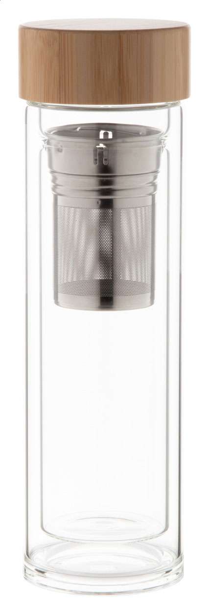 Sticlă borosilicată, termică, cu perete dublu, cu infuzor de ceai și capac de bambus. 420 ml.