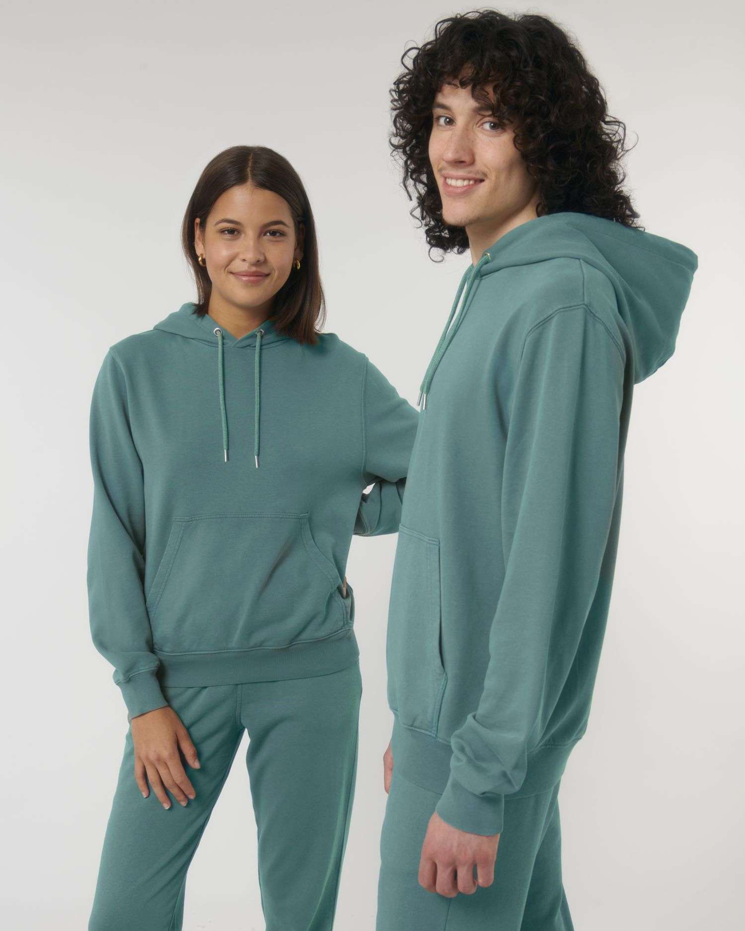 Hanorac vopsit cu efect vintage. Glugă dublată, șnur rotund și buzunar frontal. Confortabil și modern.