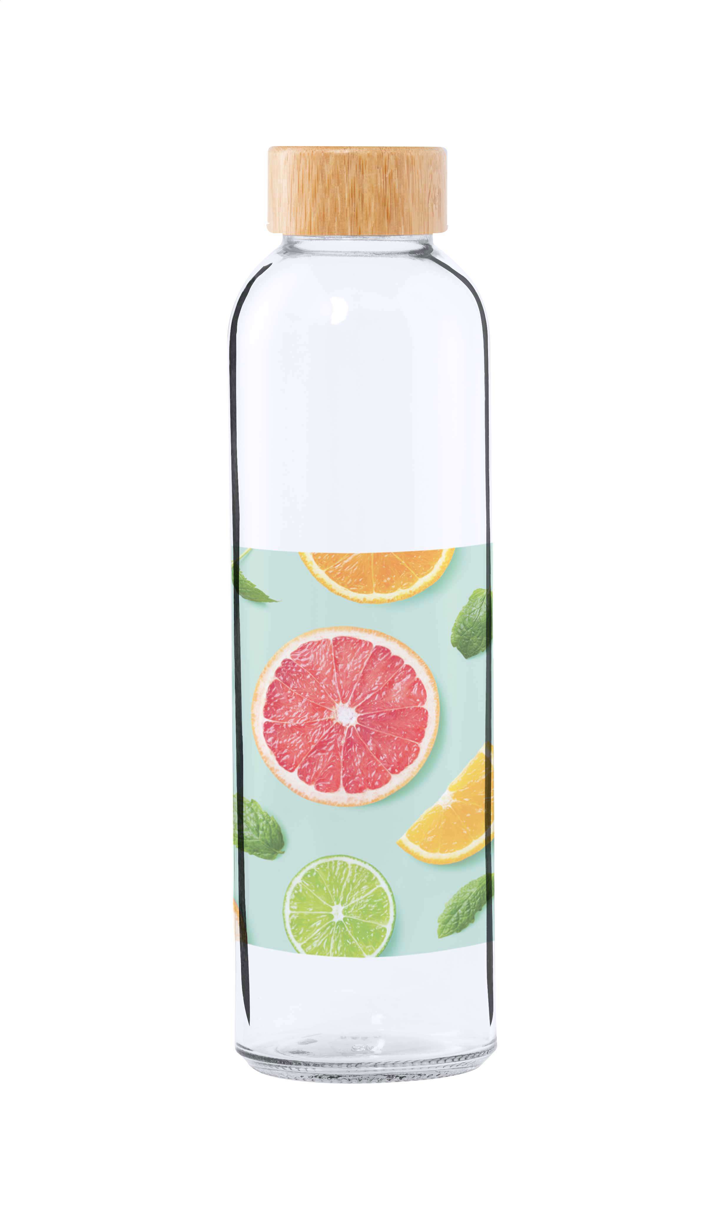 Sticlă din sticlă, cu capac din bambus, 500 ml. Nu este potrivită pentru băuturi carbogazoase.