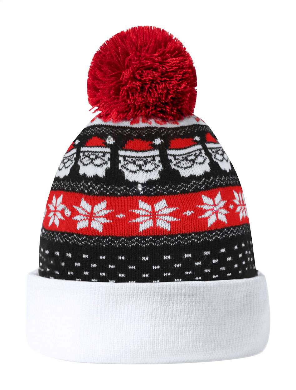 Căciulă de iarnă tricotată, din acril cu pompon și 6 LED-uri cu 3 moduri de iluminare, design de Crăciun. Include baterie tip buton.