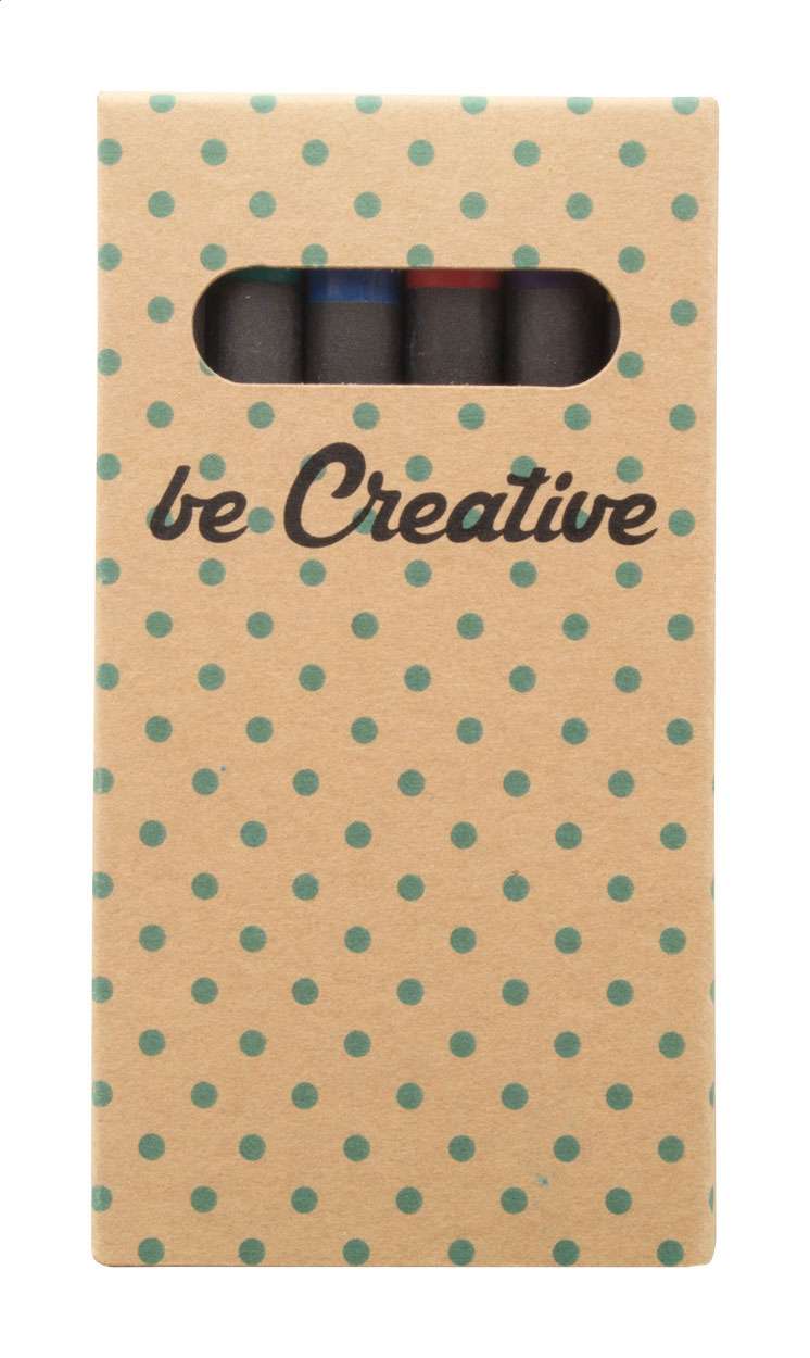 Creioane colorate (6 buc), acoperite in hârtie neagră, în cutie de hârtie kraft imprimată color. Prețul include imprimarea digitală. MOQ: 100 buc