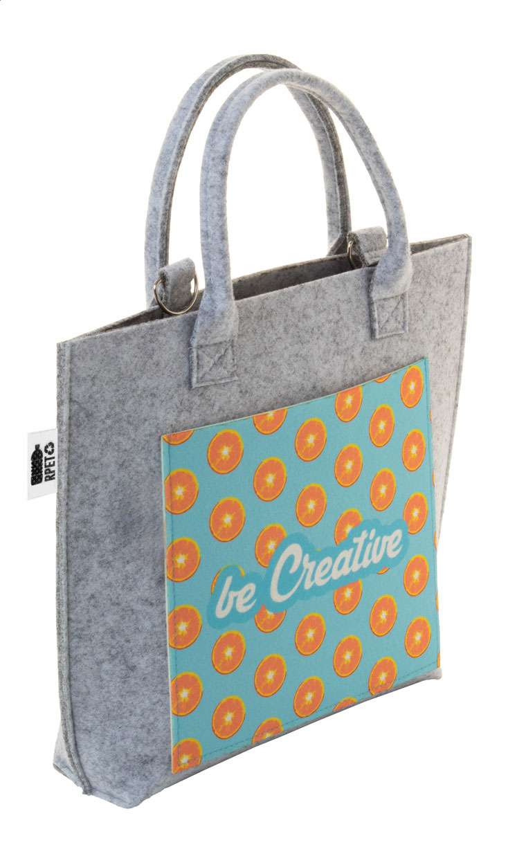Geantă crossbody pentru femei, realizată la comandă, din fetru RPET, cu buzunar frontal imprimat color. Cu mânere scurte, curea de umăr detașabilă și etichetă distinctivă RPET. Pretul include imprimarea prin sublimare. MOQ: 25 buc.