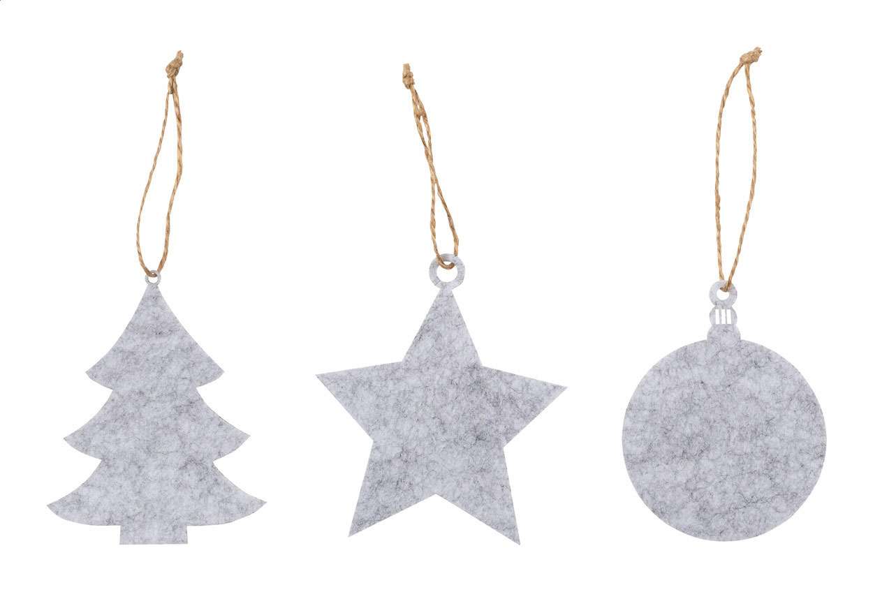 Set ornament pom de Crăciun, 3 bucăți, din pâslă, cu snur de iută. Include formă glob, stea și de pom de Crăciun.