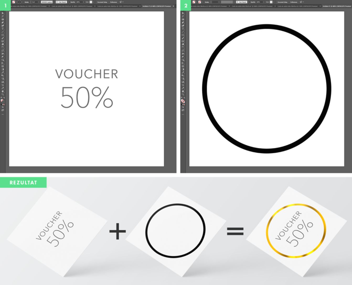 Realizează design-ul pe două pagini separate, cu mărimi identice. Primul este destinat pentru printul CMYK, respectiv a doua pentru stratul de folio. Poziționarea elementelor trebuie făcut cu precizie, astfel ca odată suprapuse, ele să alcătuiască imaginea de întreg vizat.