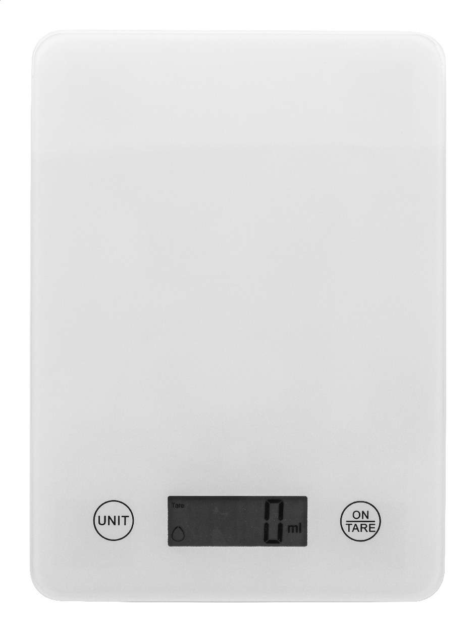 Cântar de bucătărie digital, cu platformă de cântărire din sticlă securizată și baterie reîncărcabilă USB încorporată (200 mAh). Capacitate: 5 kg, gradație 1 g, unități de măsură: g/oz. Cu indicator apă/lapte ml. Include cablu de încărcare USB.