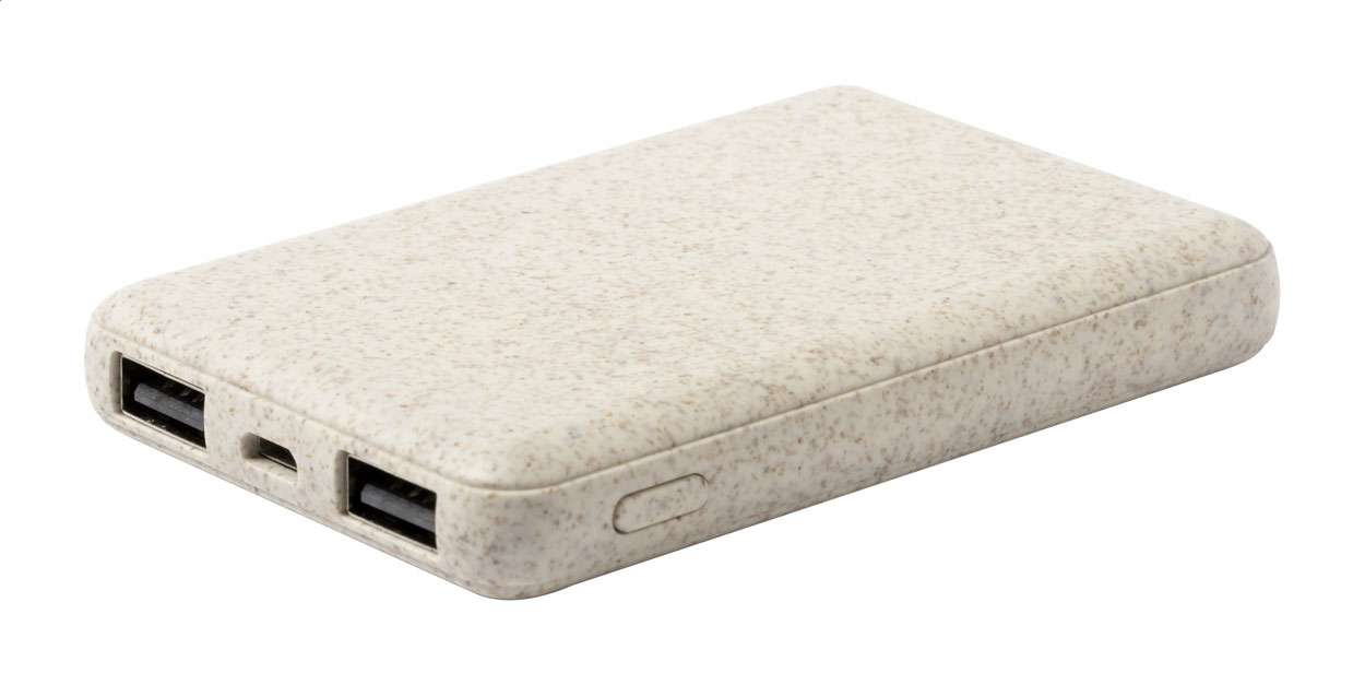 Power bank din plastic ecologic din fibre de paie de grău. Baterie 5000 mAh și 2 iesiri USB. Se livrează cu cablu de încărcare micro USB.