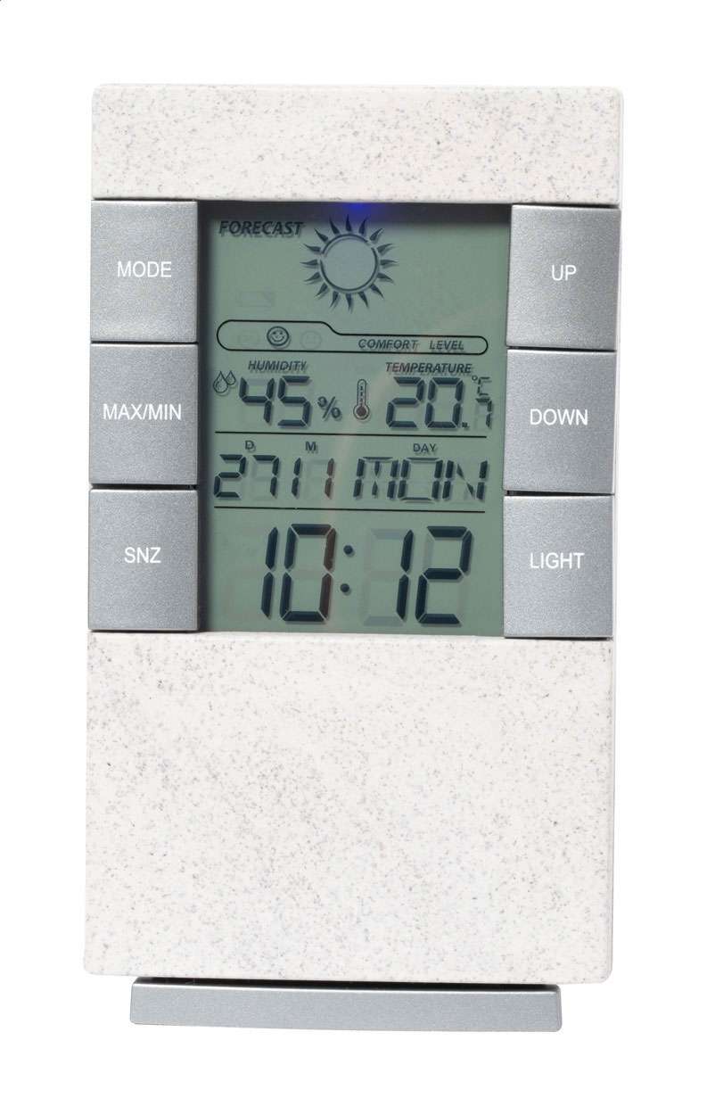 Ceas digital din plastic ecologic din paie de grâu și stație meteo cu termometru și afișaj de umiditate. Funcționează cu 2 baterii AAA, fără baterii.