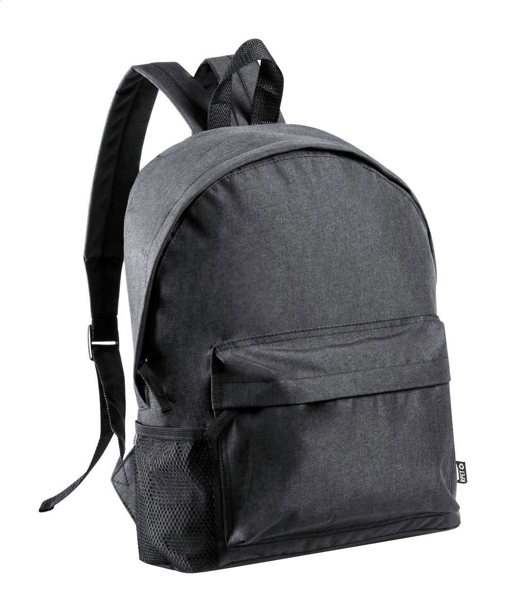 Rucsac cu buzunar frontal cu fermoar, buzunar lateral cu plasă, spate și bretele căptușite. Poliester PET reciclat 600D. Cu etichetă distinctă RPET.