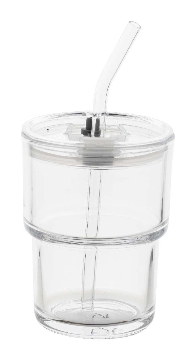 Pahar de voiaj, din sticlă, cu capac de plastic și pai de sticlă. 400 ml.