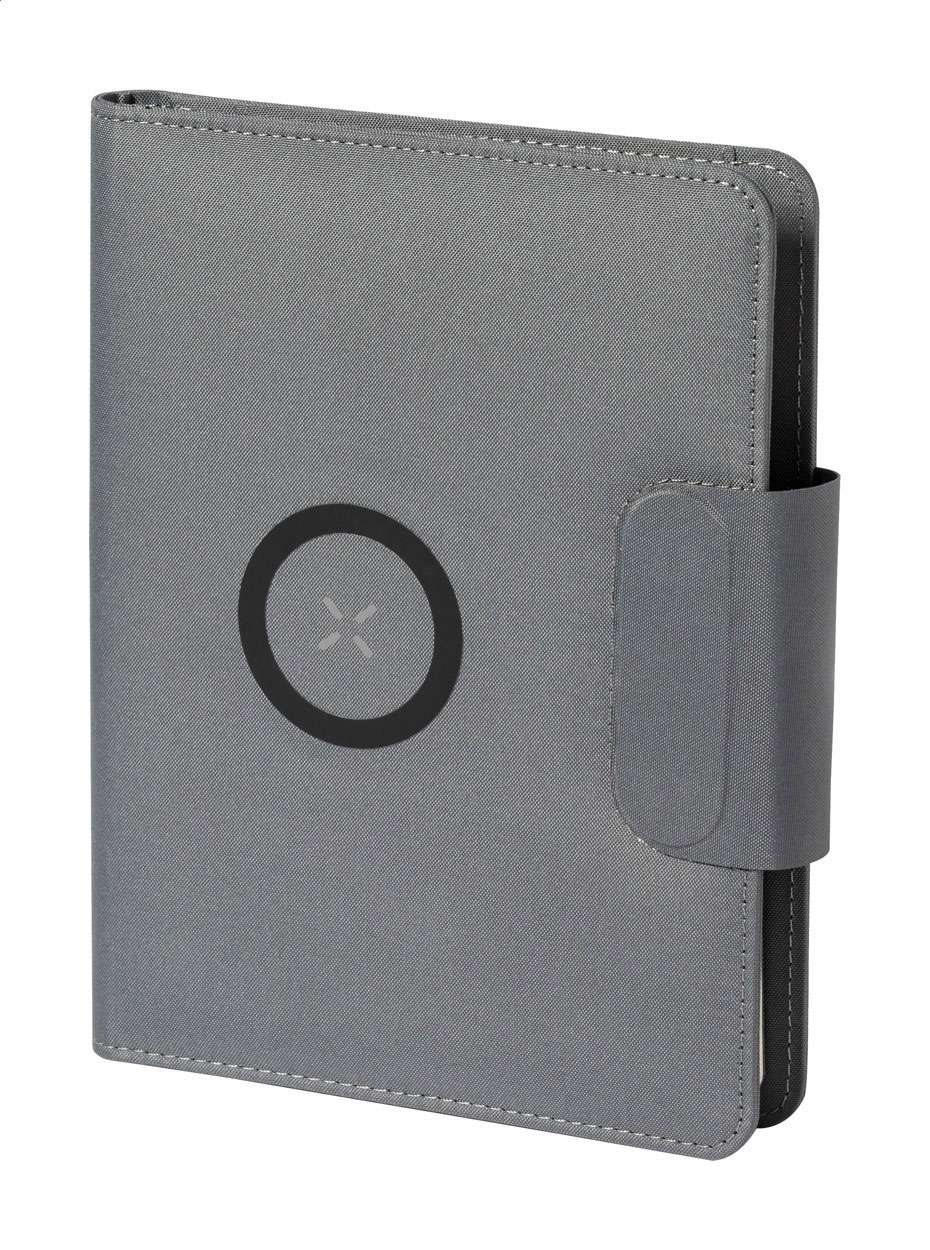 Mapă pentru documente, din poliester 300D RPET, dimensiune A5, cu notebook cu 65 de foi dictando, încărcător rapid magnetic încorporat (10W), power bank de 5000 mAh cu port pentru încărcător USB și suport mobil pliabil. Include inel metalic autoadeziv pentru a utiliza funcția magnetică pe orice dispozitiv încărcat fără fir. Inclusiv cablu de încărcare USB.