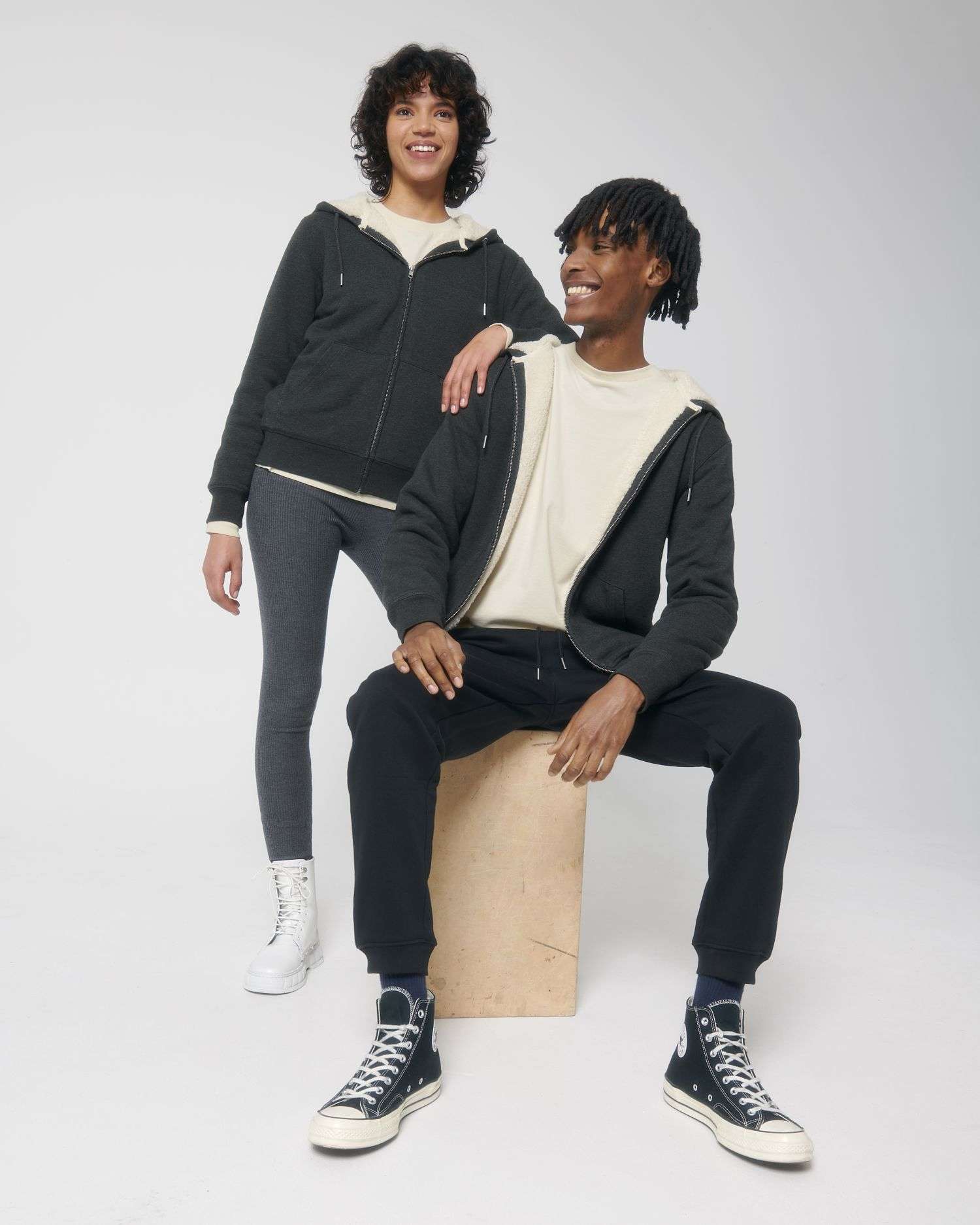 Hanorac cu interior tip sherpa reciclat. Glugă, fermoar acoperit și buzunar frontal. Confortabil și călduros.