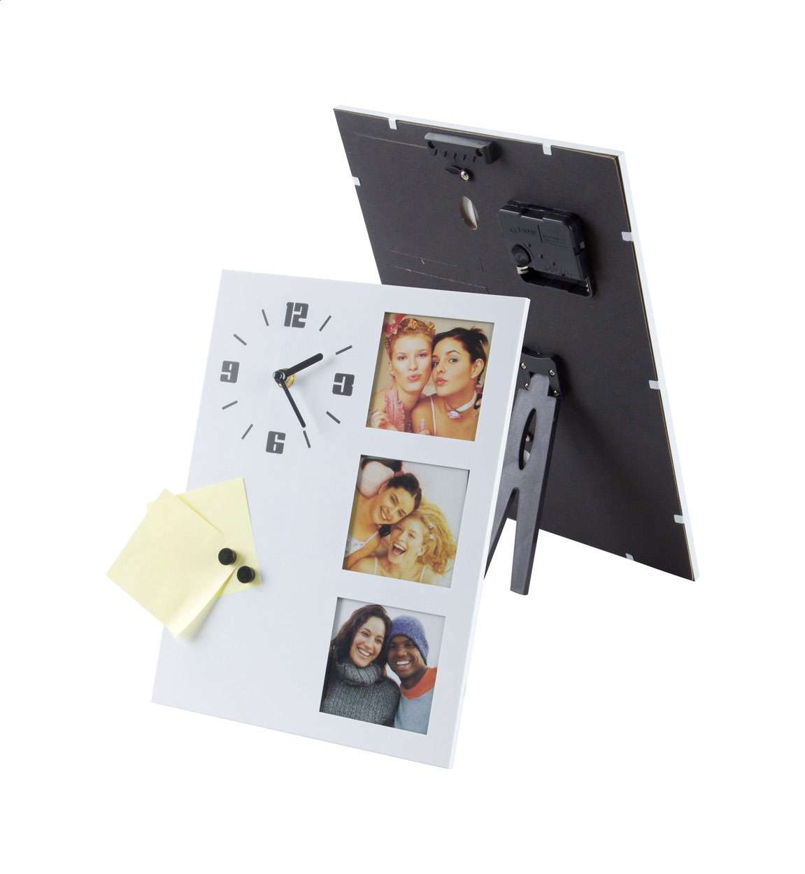 Ceas de masă, cu 3 compartimente foto (75x75 mm) și magneți. Funcționează cu 1 baterie AA, livrat fără baterie.