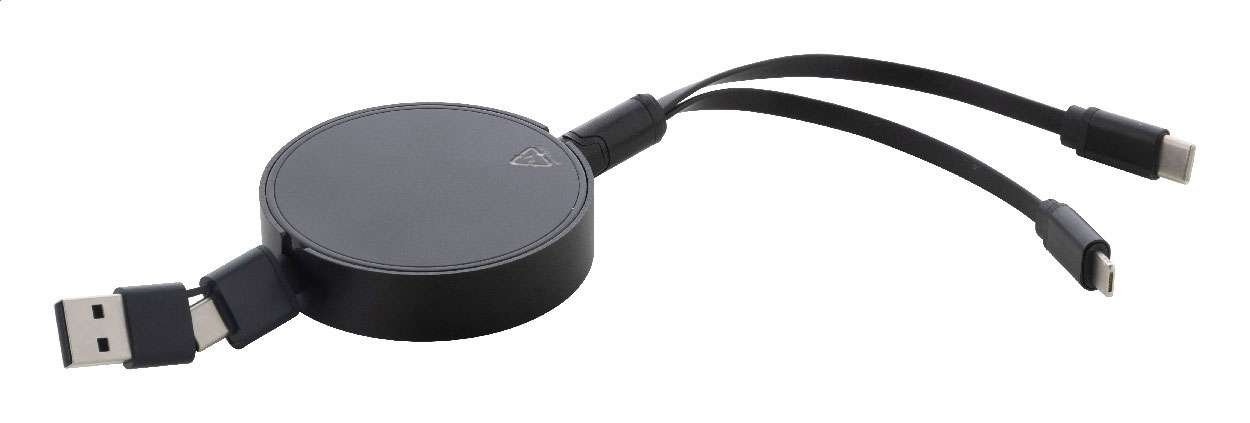 Cablu de încărcare USB telescopic din aluminiu reciclat. Cu conectori micro USB, USB-C și Lightning. Cu intrări USB și USB-C.