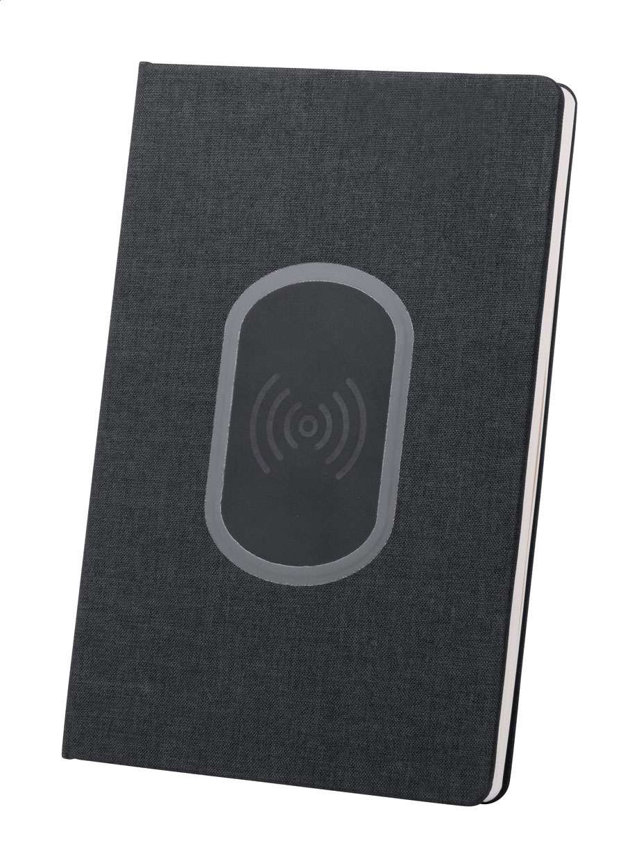 Notebook acoperit cu poliester 300D, cu încărcător fără fir încorporat (5W) și 80 de file dictando. Dimensiune A5. Inclusiv cablu de încărcare USB.