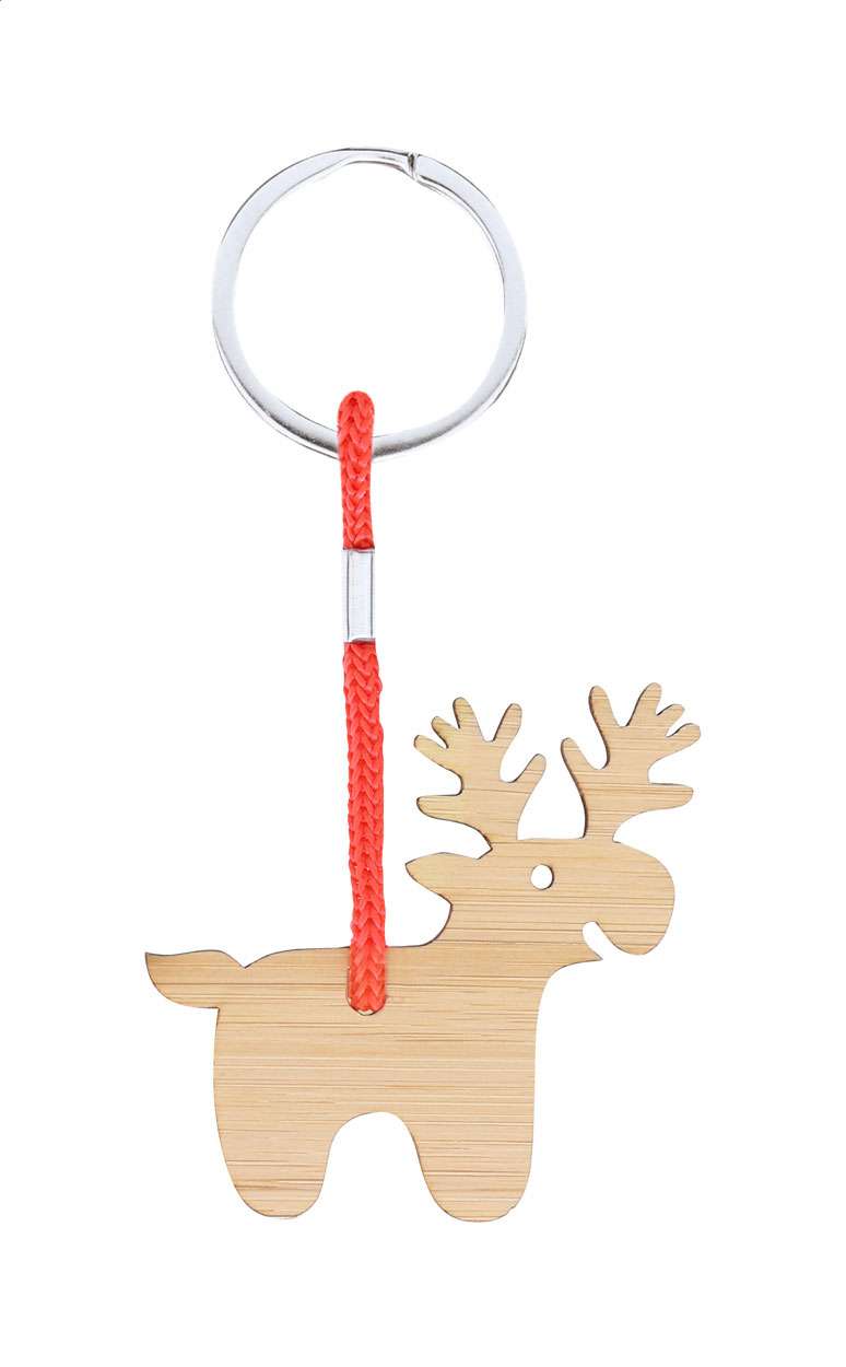 Breloc de Crăciun, din placaj de bambus, cu șnur roșu și inel metalic.