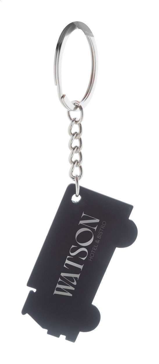 Breloc din oțel inoxidabil reciclat, în formă de camion, cu finisaj cauciucat. Cu acoperire specială pentru gravarea laser în oglindă.