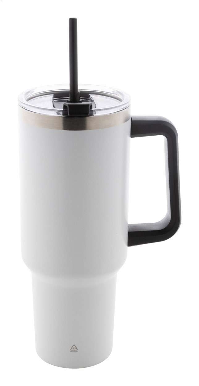 Cană termoizolată, din oțel inoxidabil reciclat, cu perete dublu, cu capac de băut PS și pai din PP. 1200 ml.