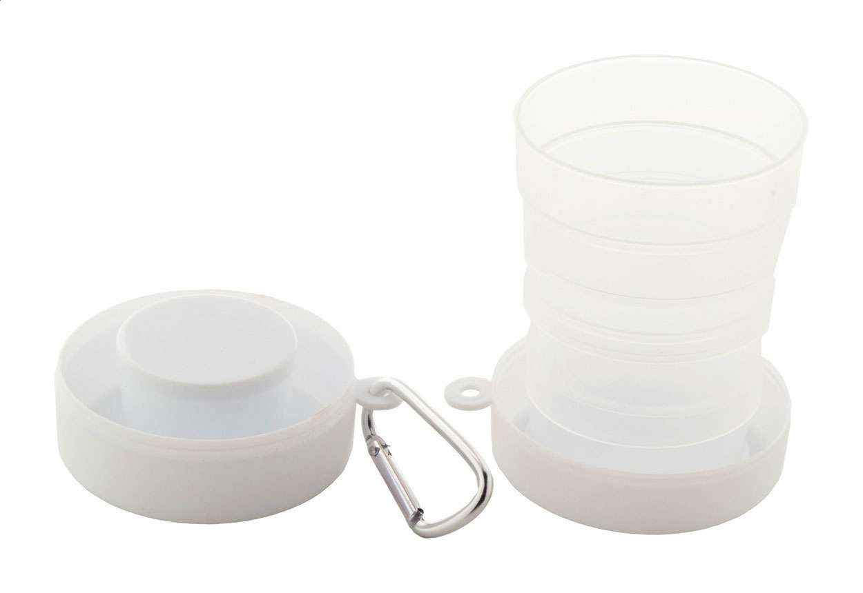 Pahar pliabil din plastic PP reciclat, cu compartiment pentru pastile și carabină metalică. 220 ml. Fără BPA.