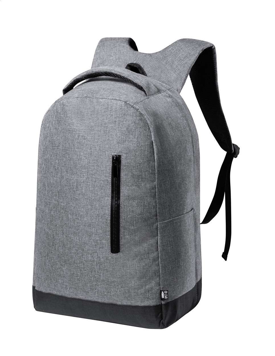 Rucsac din material reciclat, cu compartimente cu fermoar, compartiment căptușit pentru laptop (15") și tabletă (12"), curea de cărucior, spate ergonomic și curele de umăr. Cu buzunar ascuns anti-furt. Poliester reciclat 600D.