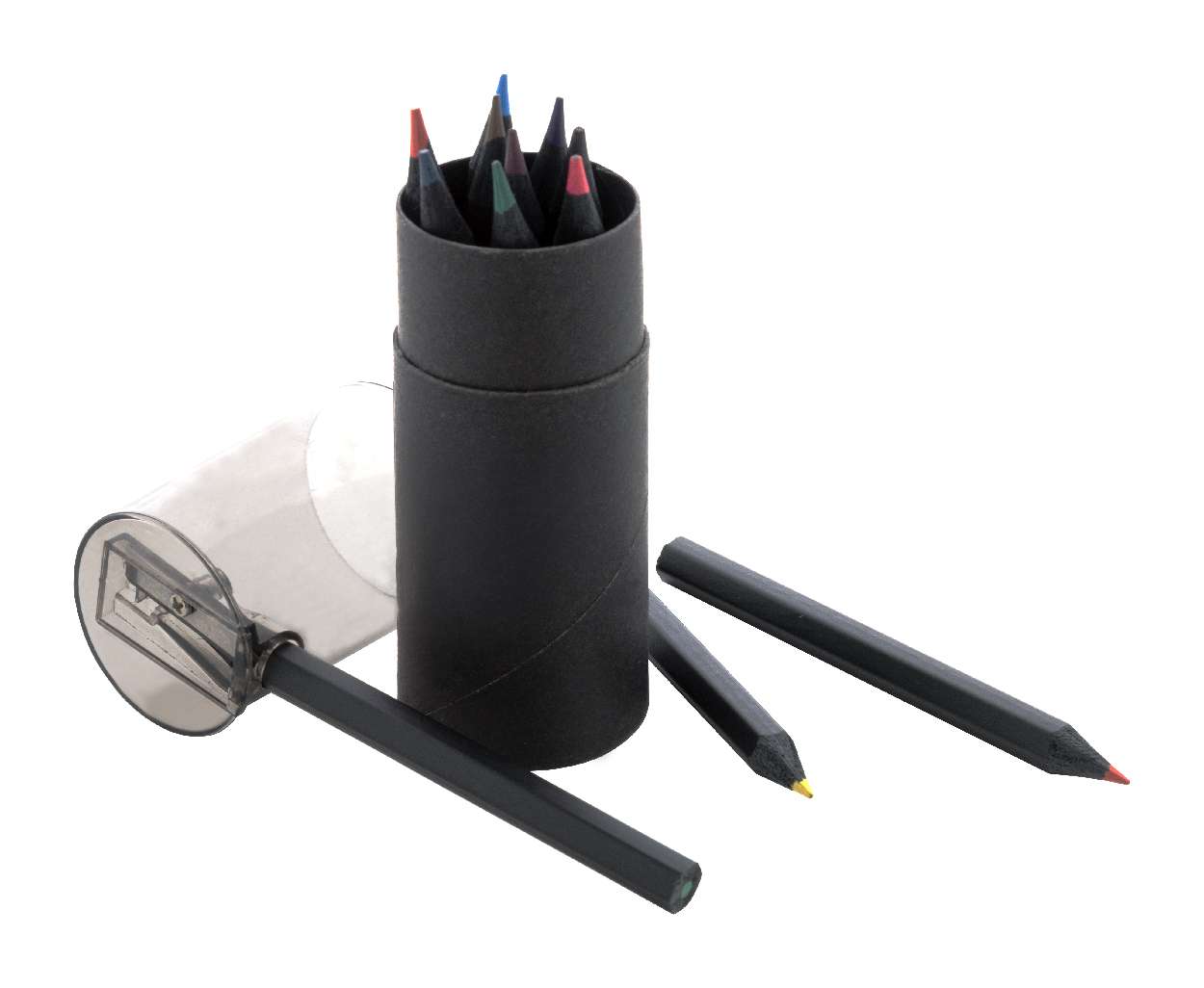 Set de 12 creioane colorate, din lemn negru, în carcasă rotundă de carton negru, cu ascuțitoare din plastic.