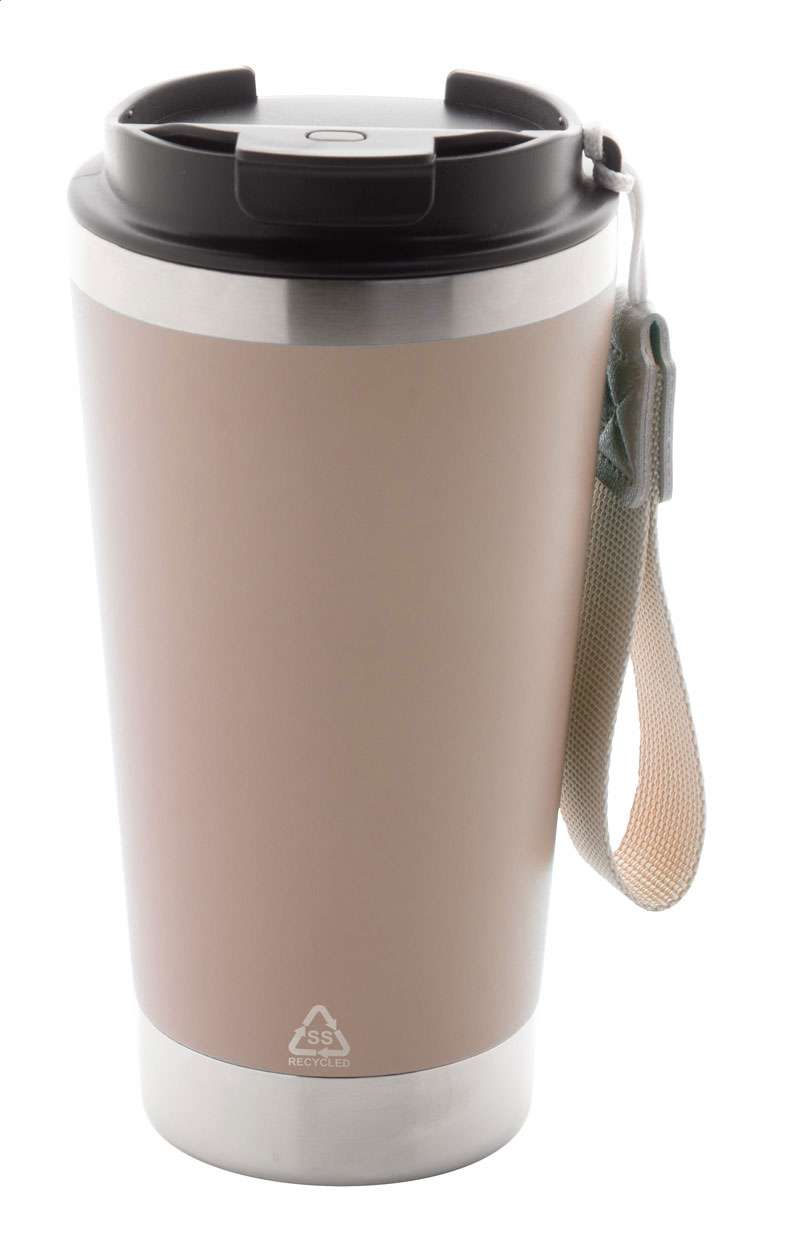 Cană termoizolată, din oțel inoxidabil reciclat, cu perete dublu, cu capac de băut din PP și curea de transport de culoare asortată. 430 ml.