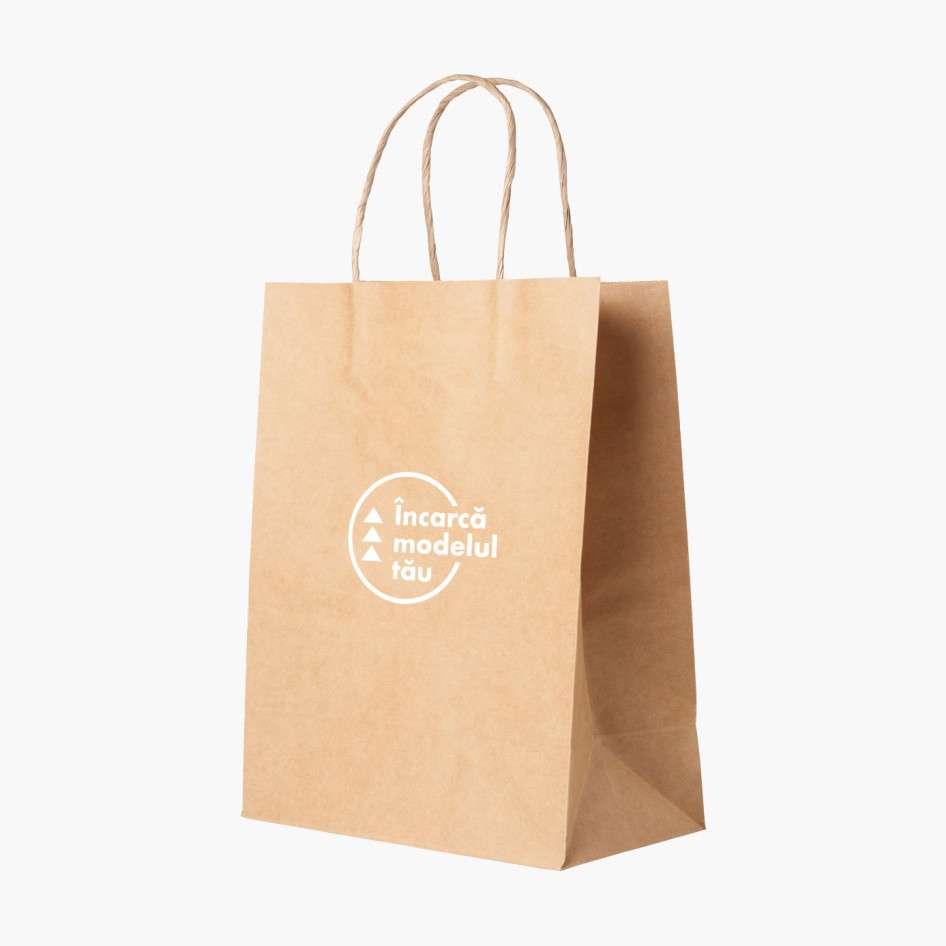 Sacoșă kraft albă sau maro, realizată din hârtie rezistentă, cu mâner răsucit. Personalizare prin tipar digital sau serigrafic, potrivită pentru produse și cadouri.