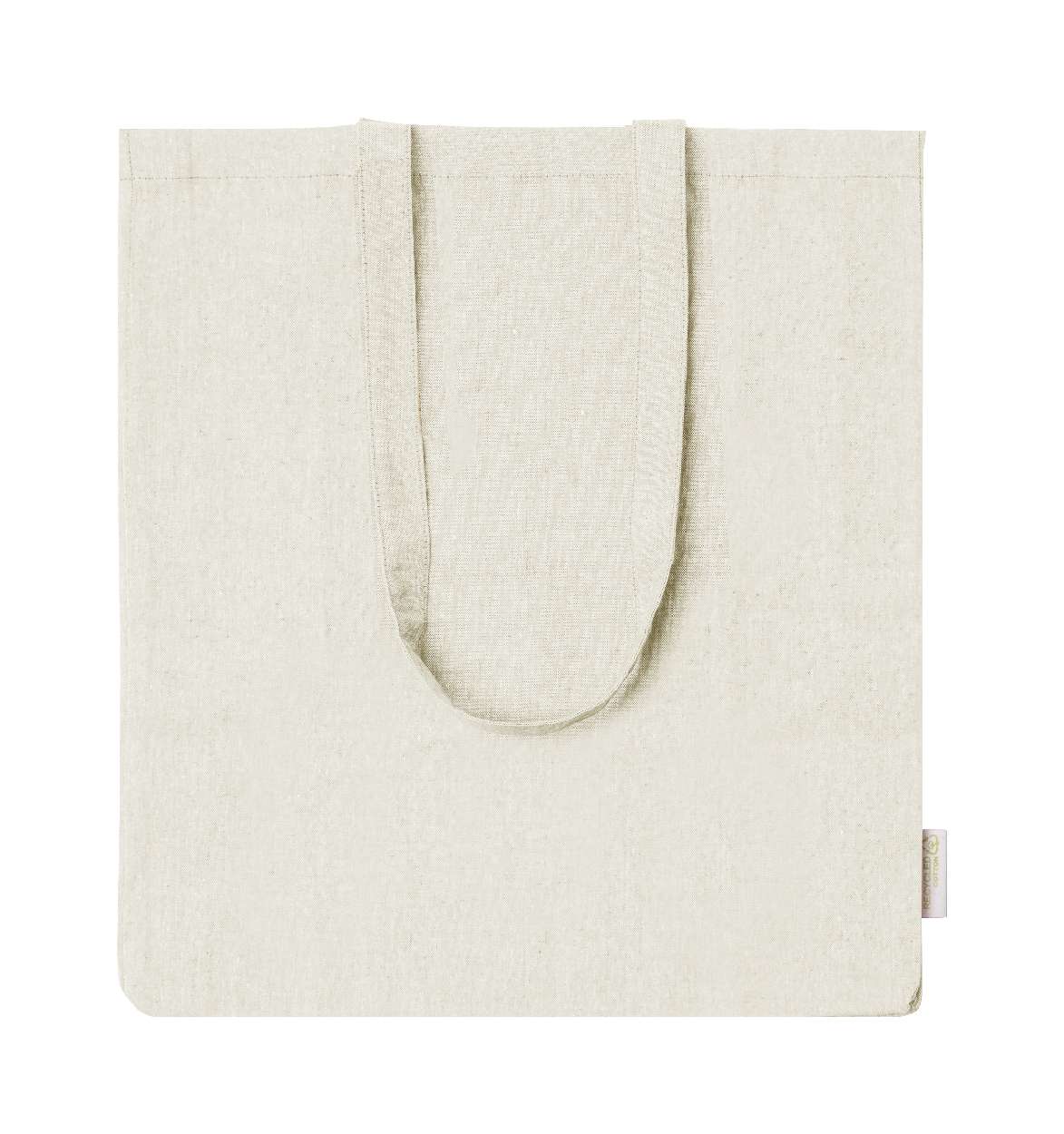 Sacoșă de cumpărături, din bumbac reciclat, cu burduf, mânere lungi și etichetă distinctivă din bumbac reciclat. 100% bumbac reciclat, 140 g/m².