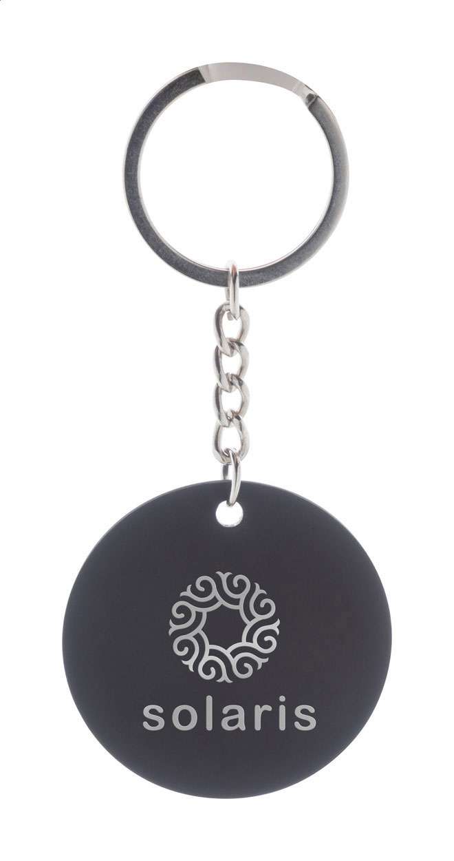 Breloc de formă rotundă, din oțel inoxidabil reciclat, cu finisaj cauciucat. Cu acoperire specială pentru gravarea laser în oglindă.