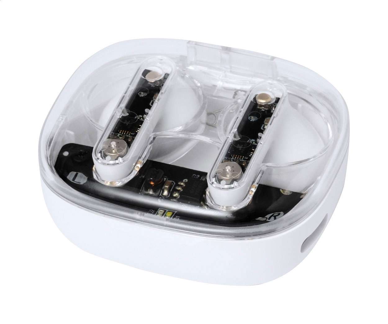Căști semitransparente, true wireless stereo (TWS), cu componente electronice vizibile și funcție de apelare hands-free. În husă de plastic semi-transparentă pentru încărcător. Inclusiv cablu de încărcare USB.