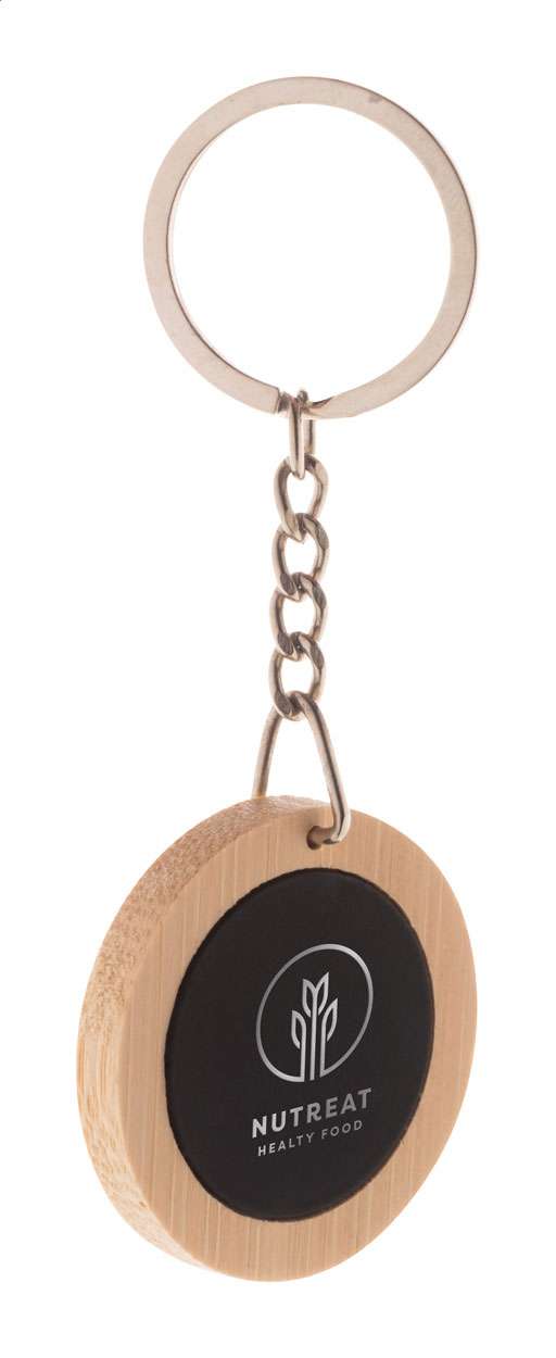 Breloc din bambus cu placă din oțel inoxidabil, cu finisaj cauciucat și inel metalic. Cu acoperire specială pentru gravarea laser în oglindă.