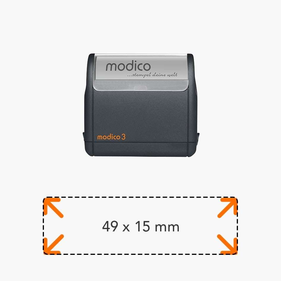 Ștampilă Modico 3, dimensiune 49x15 mm, ideală pentru texte complete de firmă. Amprentă uniformă și cerneluire controlată pentru utilizare zilnică.