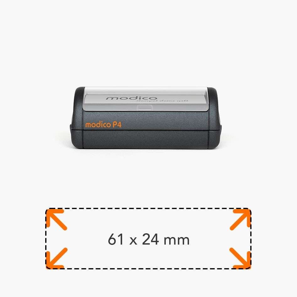 Ștampilă Modico P4 cu amprentă 61x24 mm, potrivită pentru informații extinse. Imprimare uniformă, cartuș durabil și personalizare completă cu text și logo.