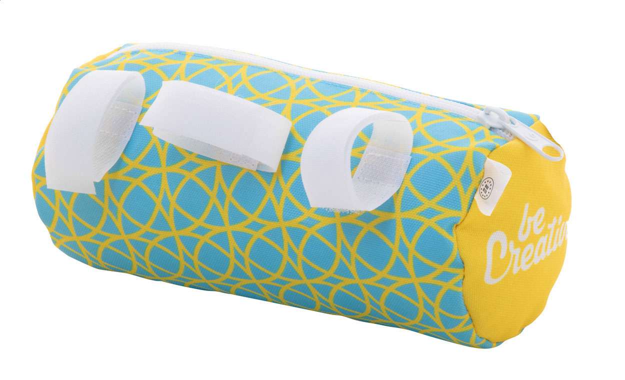Geantă pentru ghidon de bicicletă, realizată la comandă, cu fermoar, din poliester 600D RPET, cu curele velcro reglabile. Cu grafică imprimată prin sublimare integrală ?i etichetă distinctivă RPET. MOQ: 25 buc.