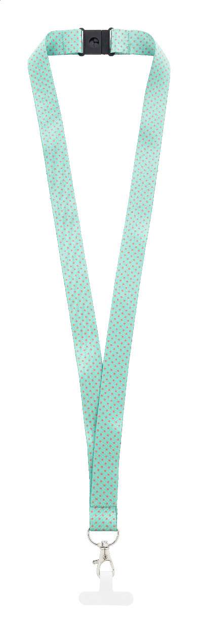 Lanyard cu suport de telefon mobil, din RPET, realizat la comandă, cu carabină metalică, cataramă de siguranță și inserție de telefon din hârtie rezistentă la rupere. Grafică imprimată prin sublimare pe ambele părți. MOQ: 100 buc.