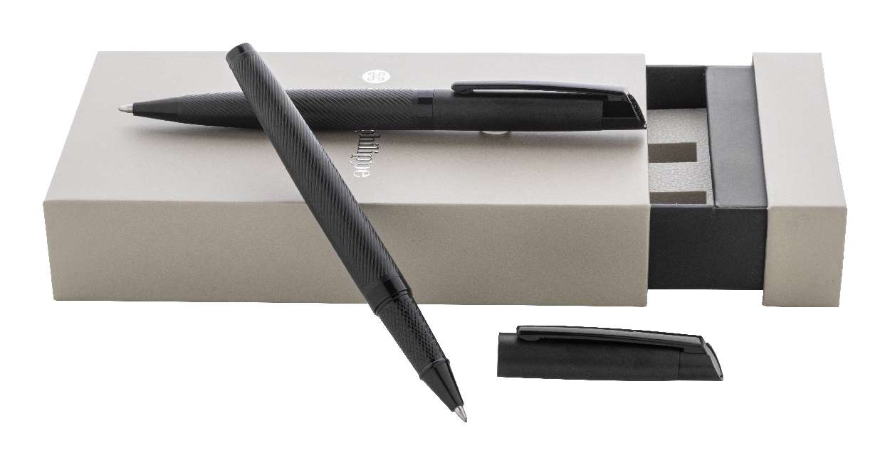 Set elegant de pix și roller, din metal, cu corp texturat diagonal. În cutie cadou în două culori, cu mină albastră. Produs marca André Philippe.