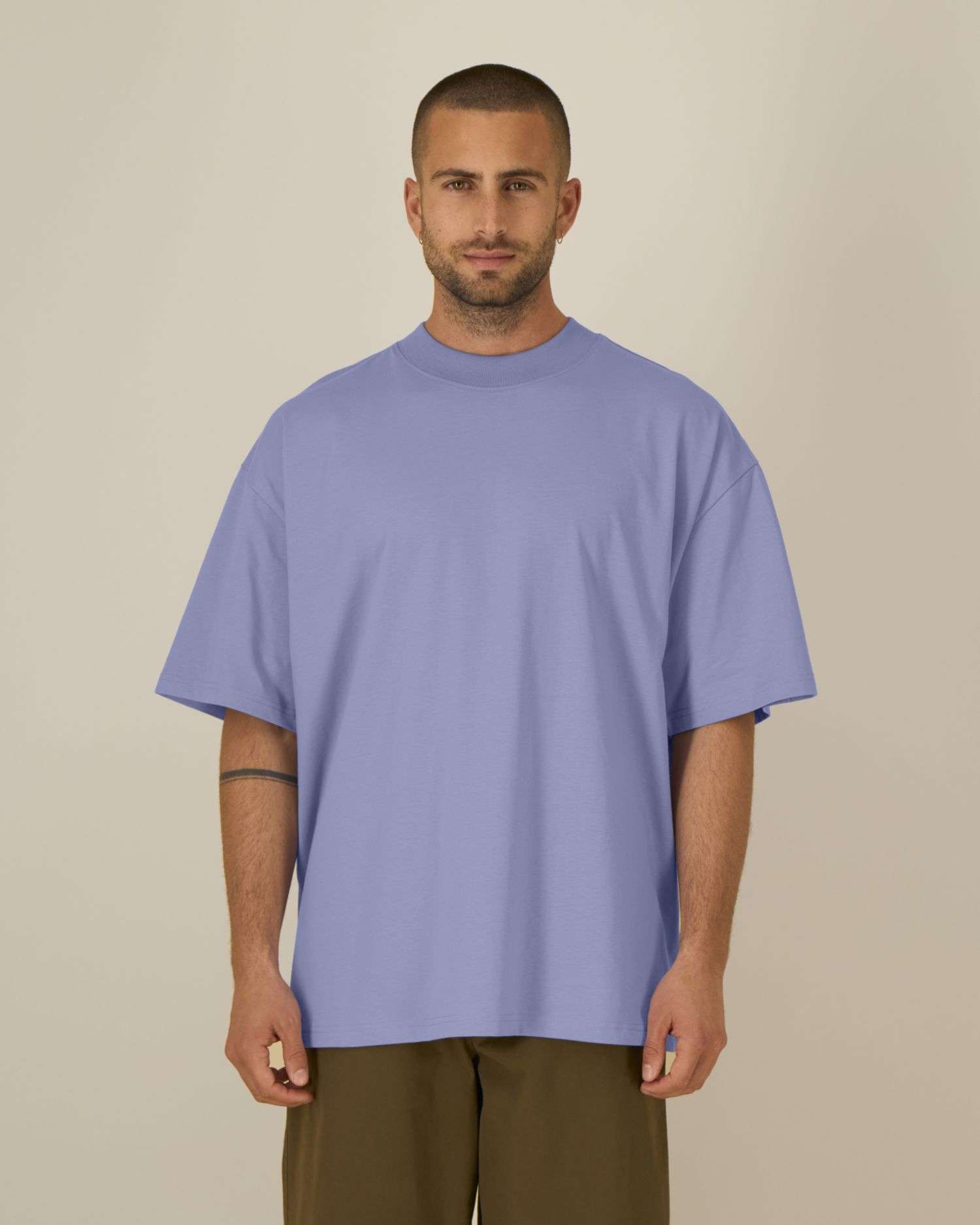 Tricou cu umeri relaxați și guler scurt. Finisaje curate, tiv dublu și detaliu decorativ la spate.