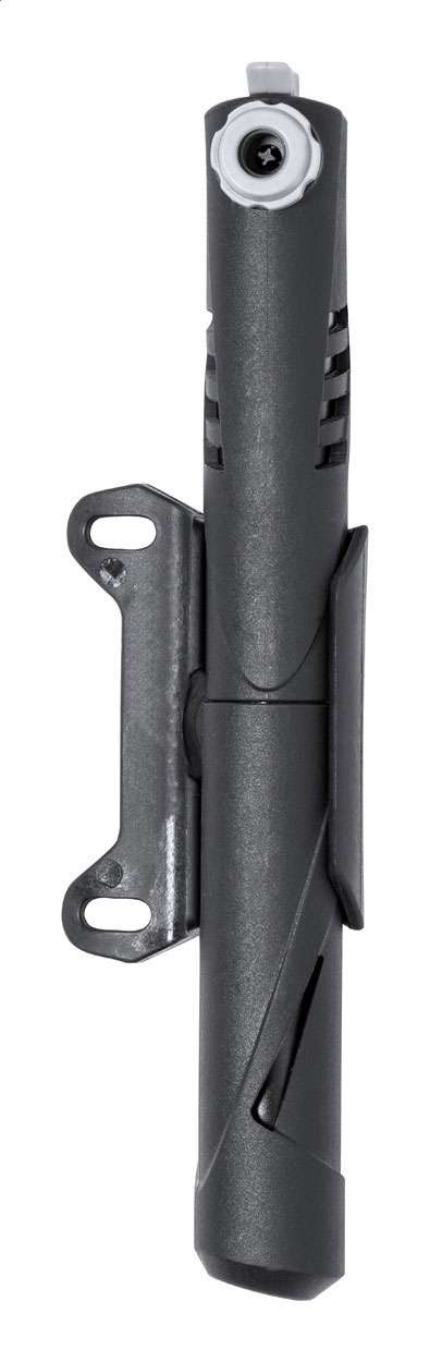 Mini pompă manuală pentru bicicletă, cu suport montat pe cadru.