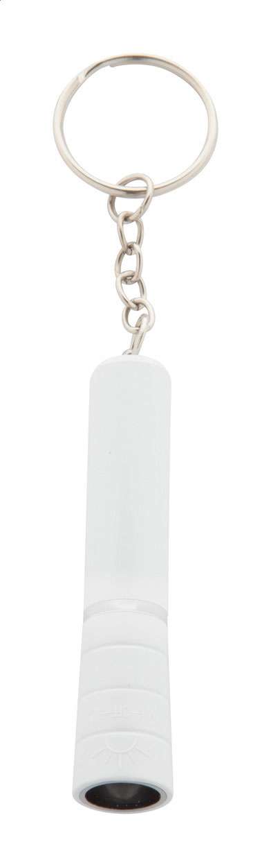 Mini lanternă din plastic cu LED alb și inel metalic. Cu baterie.