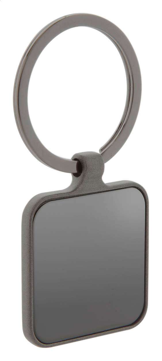 Breloc pătrat din metal cu finisaj metalic și suprafeţe strălucitoare pe ambele părți.