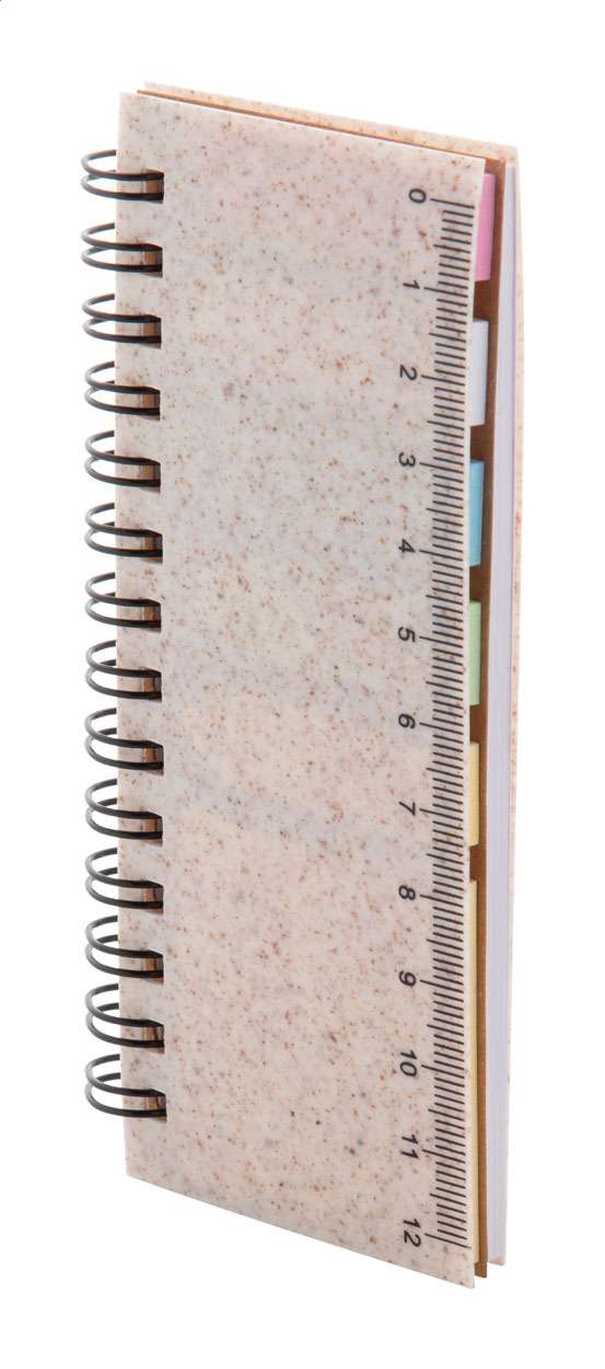 Caiet ecologic, cu spirală, cu coperta din plastic din paie de grâu, cu 40 de foi dictando, din hârtie reciclată, 25 de note adezive și 25 de markere de pagină (în 5 culori diferite). Cu riglă de 12 cm pe copertă.