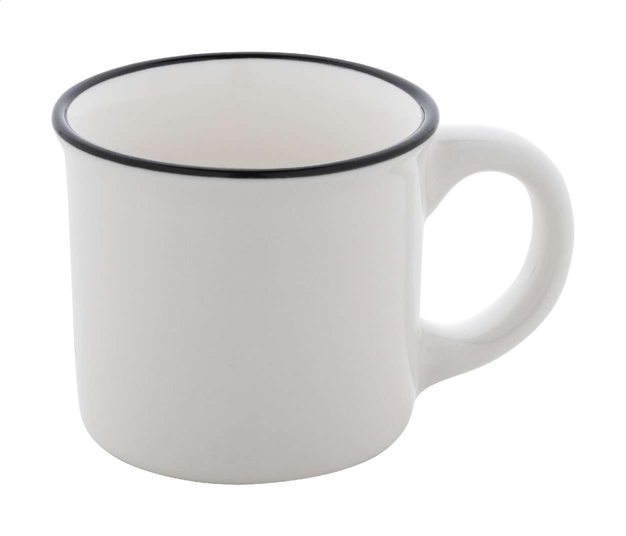 Cană ceramică, mini, vintage, cu margine neagră, interior alb și exterior colorat, 90 ml. În cutie de hârtie kraft.